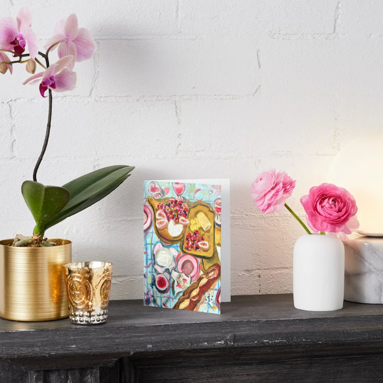 Bursting with colour and texture, this vibrant food-themed flat lay brings pizza, patisserie, and painterly joy together. A fun and modern choice for birthdays or foodie notes.